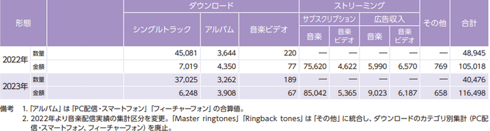 其中,流媒体市场规模在五年间扩大了一倍多,销售额达1056.17亿日元,同比增长14%;数字音乐下载市场自2000年代中期以来持续萎缩,销售额仅有102.24亿日元,同比减少11%。