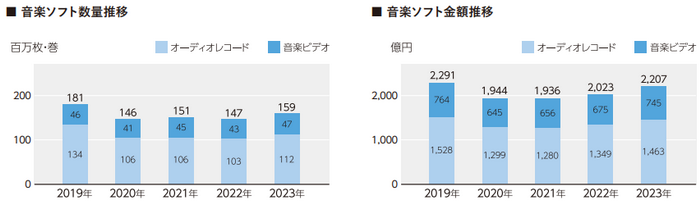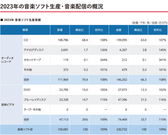日本作为全球第二大音乐市场,实体音乐(包括音频唱片、音乐短片)依旧占据了录制音乐产业的大半壁江山,2023年的市场规模达到2207亿日元,同比增长9%;产量为1.59亿张/卷,同比增长9%。