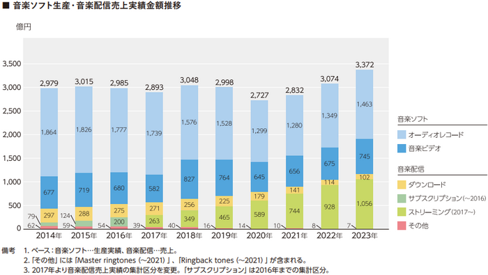 日本唱片业协会最新发布的数据显示,日本录制音乐(包括实体音乐和网络音乐)市场连续三年保持增长势头,2023年销售总额达3372亿日元,较2022年增长10%,创近11年来最高销售纪录。