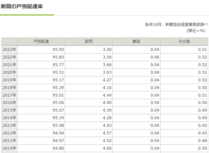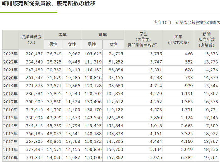近年来,随着互联网技术的迅猛发展,新媒体对传统报纸销售市场造成了巨大冲击。日本报业协会公布的数据(截至每年10月)显示,2023年日本报纸发行量约2,859万份,较2004年减少了46.0%,不少地方性小报被迫停刊退出市场。报纸专卖店也随之减少,由2001年的21,615家降至2023年的13,373家,总数缩水了近40%。