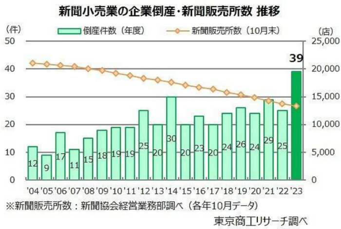 受新冠疫情影响,插页广告收入大幅下滑,报纸专卖店依靠报业公司补贴和无息贷款支持才渡过难关。此外,运输成本和人工成本增加也给报纸专卖店带来沉重负担。有评论认为,随着财政支持效果的消退,报纸专卖店破产倒闭现象可能将会进一步加剧。