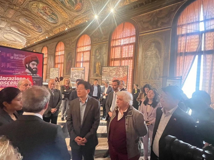 4月9日,“‘探索与求知’:马可·波罗东方城市奇迹之旅——纪念马可·波罗逝世700周年文化创意展”在意大利威尼斯圣马可国家图书馆开幕,中共中央宣传部副部长张建春、威尼斯市副市长玛尔、中国驻米兰总领事刘侃、中国驻