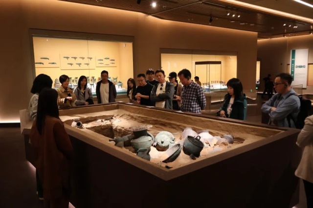 在新郑工作站,课题组成员走进文物陈列室,在考古专家指导下,近距离考察五千年前的仰韶彩陶、两千五百多年前的祭祀编钟与青铜宝剑,以及两千年前的博山炉、一千年前的圆瓷枕等精美文物。这一刻在,这间小小的陈列室,时间仿佛被凝结与浓缩,让专家学者们跨越千年与古人直接对话,徜徉在源远流长、博大精深的中华文化暨礼乐文明的长河之中!
