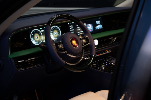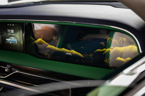 红旗·国礼内饰设计取法中国建筑理念,将重檐翘角的层次感和横向轮廓融入座驾,延伸自车头立标的贯穿中轴,浩雅中正、气度不凡;前舱“艺术画廊”,匠心倾注,浮光掠影间流动美的生机;方向盘采用经典双辐设计,“铺首衔环”巧思融入其中,尽显红旗金葵花品牌独属设计之美;旋钮周身环绕着精心镌刻的“万福纹理”,寓意着万福平安、吉祥如意;门板设计结合中式园林中的“月门”造型,形如月出沧海,勾勒空间与意境之美,非遗漆画点缀其间,大漆与金箔材质极尽雍容华贵,梅、兰、竹、菊四君子以水墨手法呈现,更添灵动雅致让人身在旅途中,亦是置身东方艺境之中;源自中式圈椅的舒享座椅,安适雅致,椅背采用精湛刺绣技艺装饰细腻描绘梅、兰、竹、菊四君子,整体设计以“春色满园”为主题与门板装饰相映成趣,为身体和心灵创造一方风雅栖居的空间。