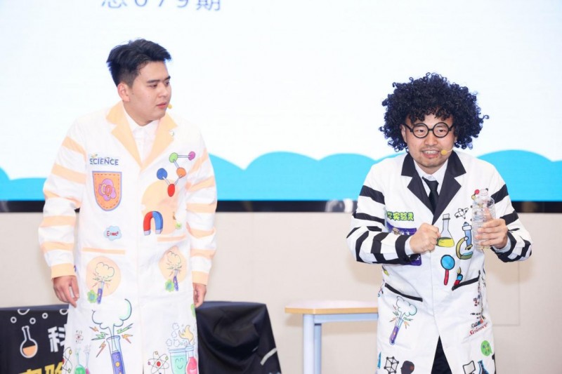 紧接着,台上演员们摇身一变,成为了穿着印花白大褂的“阿毛老师”和“小雨叔叔”,带领着现场的小朋友们一起做起了趣味科学小实验。这次的主题是“大气压”,通过一些生活中常见的物件,展示了大气压的无处不在。两个紧紧吸在一起的马桶塞,两位小朋友在两头用力拔,塞子没开,倒是马桶塞的棍子脱开了,引得现场观众一阵大笑。