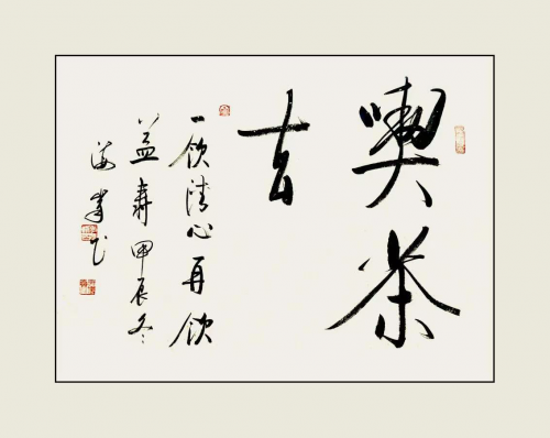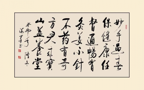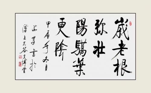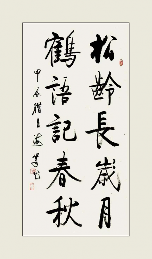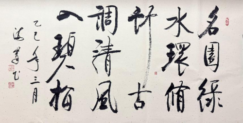 《行万里路读万卷书》、《不忘初心》、《携手构建合作共赢新伙伴同心打造人类命运同体》及几首唐诗作品,创作立意高,其用笔中锋铺毫,逆入平出,藏锋一致,非真非草。细看稼纤间出,离方遁圆,筋力老健,风骨洒脱,墨纵有余,肥瘠相称,章法布局笔触、间白风格和谐,用书法讲述中国故事。