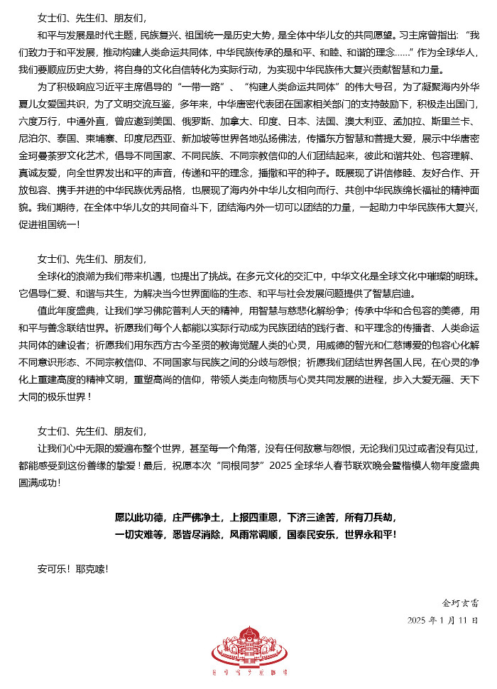 金珂玄雷上师为庆祝“同根同梦”2025全球华人春节联欢晚会暨楷模人物年度盛典发来的贺信全文